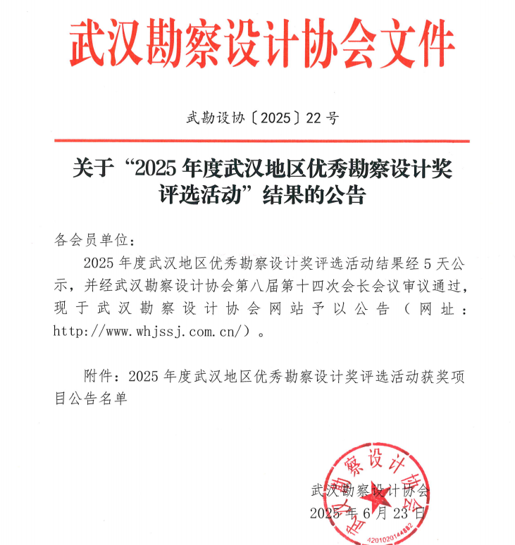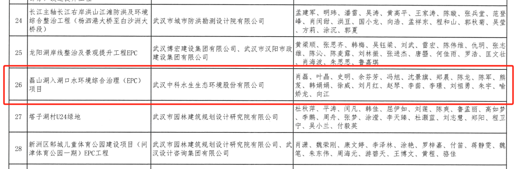 近日,武汉勘察设计协会公布了"2025年度武汉地区优秀勘察设计奖评选活动"结果,武汉中科水生公司申报的磊山湖入湖口水环境综合治理(EPC)项目荣获建筑及园林景观组设计二等奖。